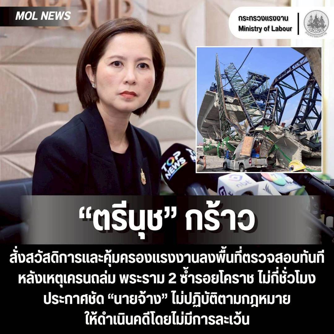 “ตรีนุช” กร้าวสั่งสวัสดิการและคุ้มครองแรงงานลงพื้นที่ตรวจสอบทันที หลังเหตุเครนถล่ม พระราม 2 ซ้ำรอยโคราช ไม่กี่ชั่วโมง ประกาศชัด “นายจ้าง” ไม่ปฏิบัติตามกฎหมายให้ดำเนินคดีโดยไม่มีการละเว้น