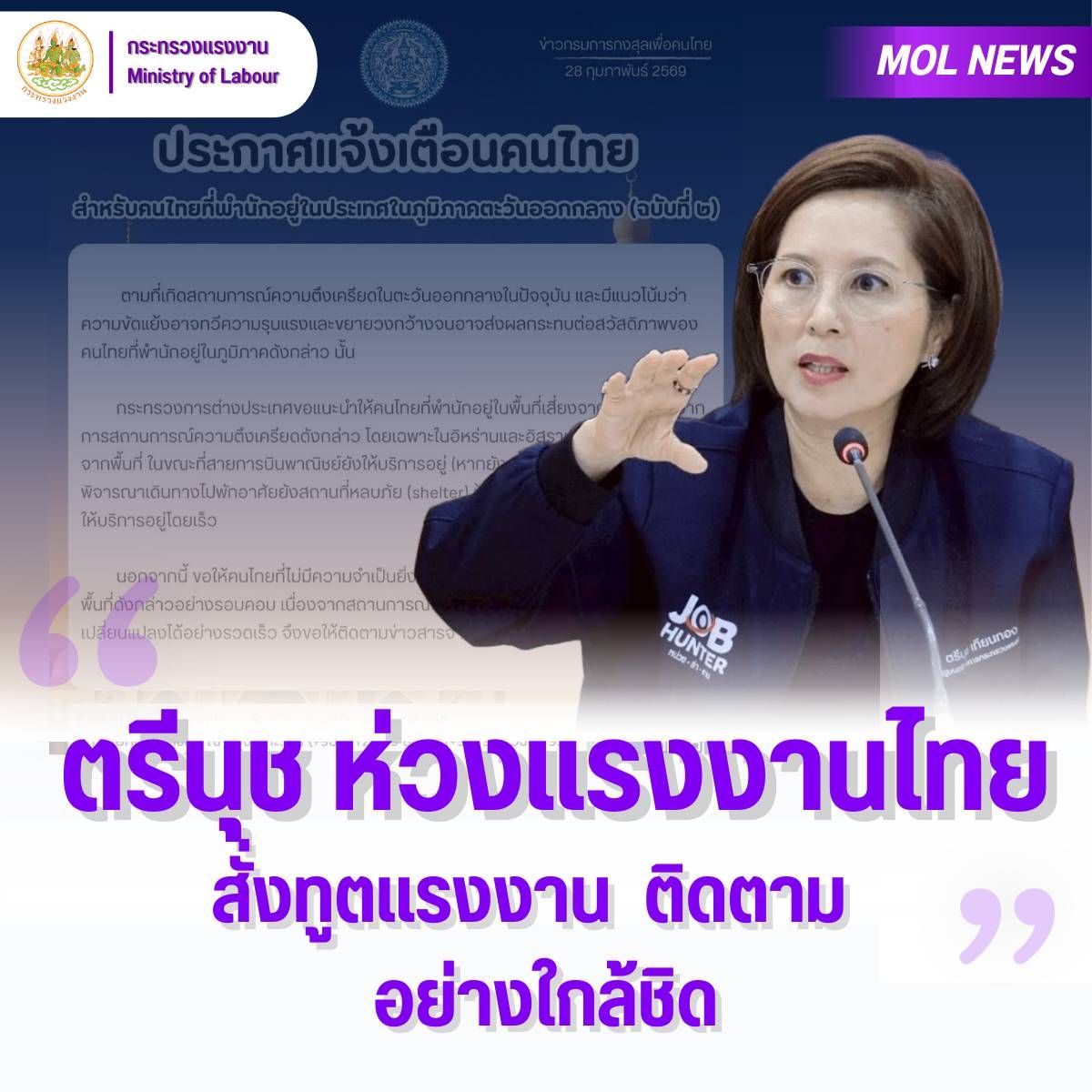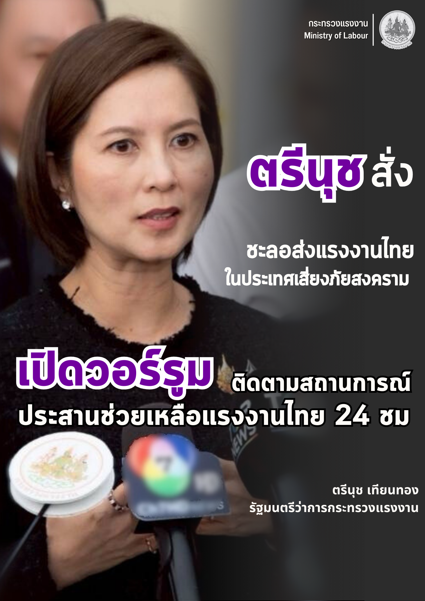 “ตรีนุช” สั่งชะลอส่งแรงงานไทยในประเทศเสี่ยงภัยสงครามหลังหารือกระทรวงต่างประเทศ มอบปลัดกระทรวงแรงงานเปิดวอร์รูมติดตามสถานการณ์ประสานช่วยเหลือแรงงานไทย 24 ชม.